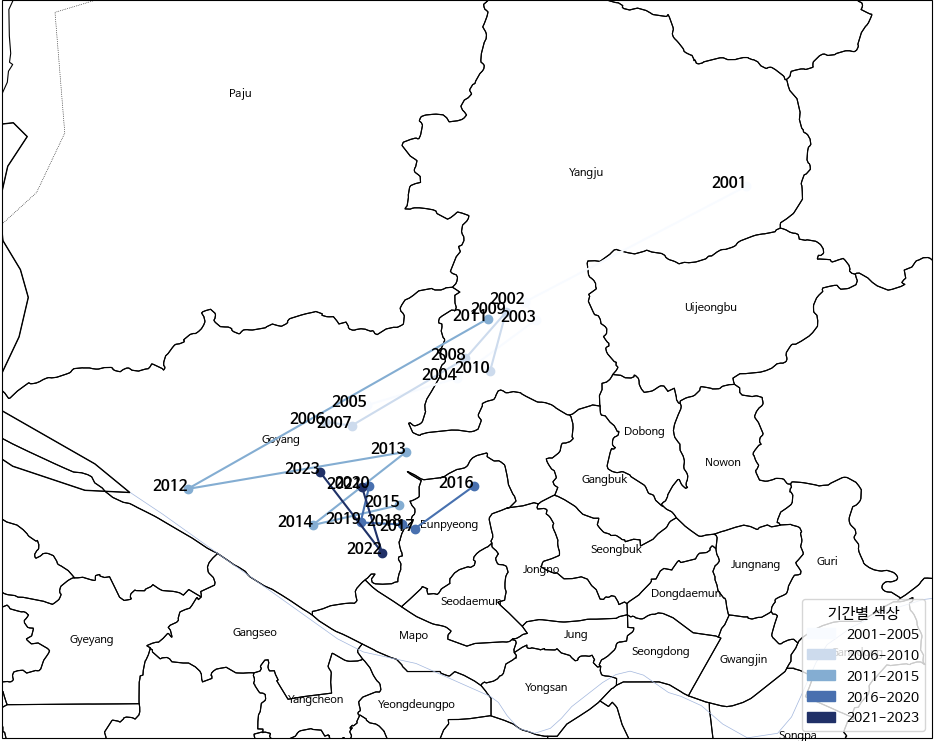 To identify temporal changes in the spatial concentration of malaria incidence, the annual weighted mean center was calculated from 2001 to 2023 using district-level case counts and geographic coordinates. In 2001, the weighted mean center was clearly located in the northeastern inland area, around the Yangju region. This indicates that malaria cases were strongly concentrated in the northern border-adjacent districts at the beginning of the study period. From 2002 to around 2010, the centroid shifted southwest toward the Uijeongbuโnorthern Goyang corridor. The movement during this period shows a gradual transition away from the far northeastern inland area and toward the northwestern part of the Seoul metropolitan region. Around 2012, the centroid moved further west compared to previous years, reaching its most southwestern position in the observed period. This suggests a temporary increase in case concentration toward the western Gyeonggi area. After 2013, the mean center shifted back slightly eastward and became more tightly clustered around the GoyangโEunpyeong boundary area. From 2014 onward, the annual centroids appear concentrated within a relatively small spatial range, indicating stabilization of the core incidence zone. By 2023, although total malaria cases increased nationally, the weighted mean center remained within this northwestern metropolitan corridor rather than returning to the original northeastern inland position observed in 2001. Overall, the enlarged map confirms a clear long-term spatial shift: malaria incidence moved from a northeastern border-focused concentration toward a more stable northwestern metropolitan-adjacent cluster.