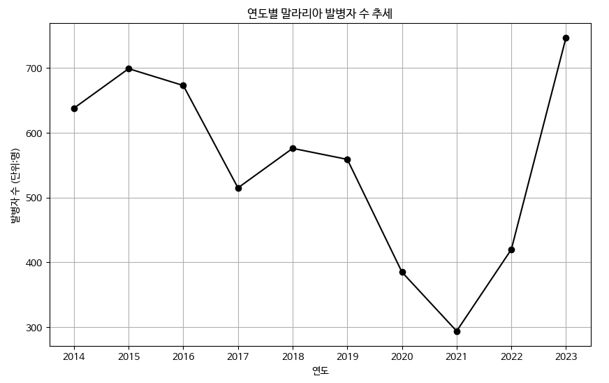Although malaria cases had generally declined over the past decade, the trend reversed after 2021 and began to rise rapidly. The sharp increase between 2022 and 2023 indicates a meaningful change, emphasizing the need for strengthened malaria prevention and management.