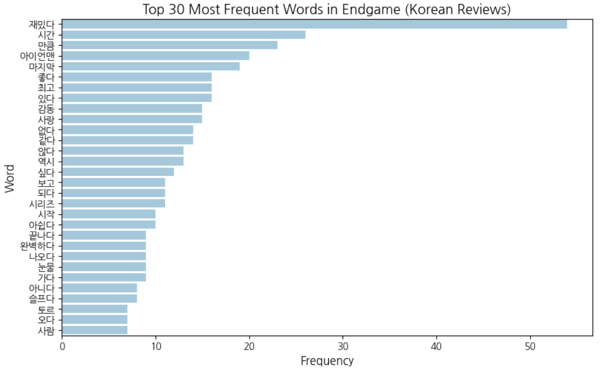 The bar chart below presents the top 30 most frequent words in Korean reviews.