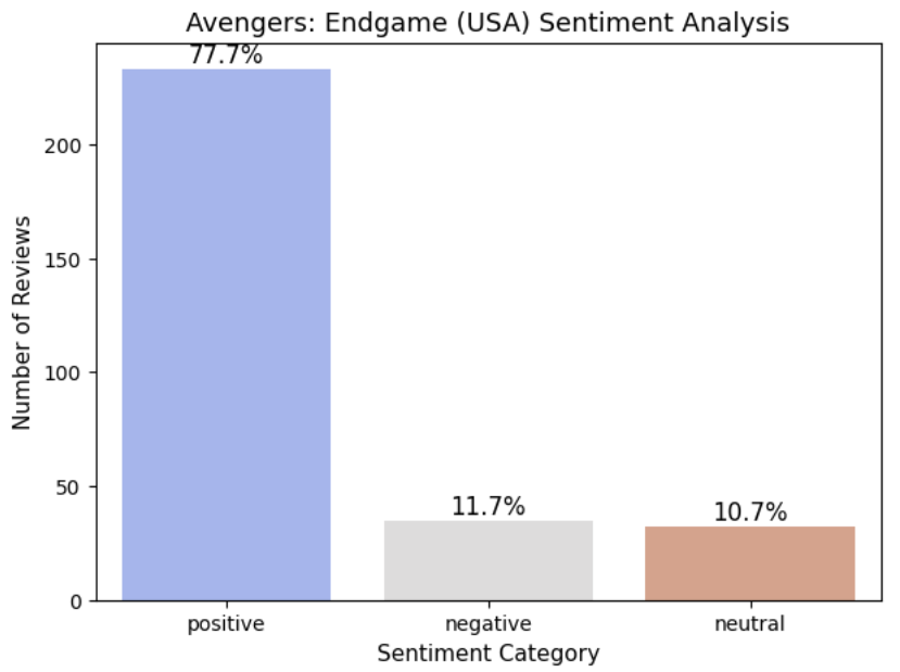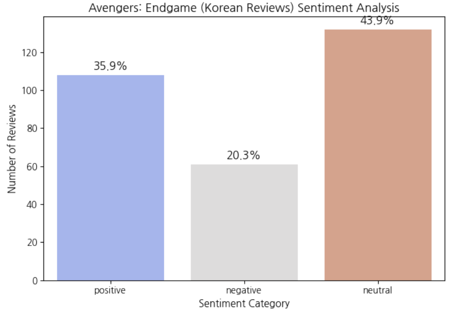 Overall, both U.S. and Korean audiences reacted positively to Avengers: Endgame. However, the sentiment analysis results reveal that emotional intensity and linguistic expression differ across cultures. The U.S. reviews demonstrated high-intensity, explicit sentiment expression, resulting in a dominant positive classification. In contrast, Korean reviews exhibited more balanced and context-driven emotional expression, leading to a higher proportion of neutral classifications. Therefore, sentiment analysis does not only measure audience preference. It also reflects deeper cultural patterns in how emotions are communicated through language. This study highlights the importance of considering cultural communication style when interpreting cross-linguistic sentiment analysis results.