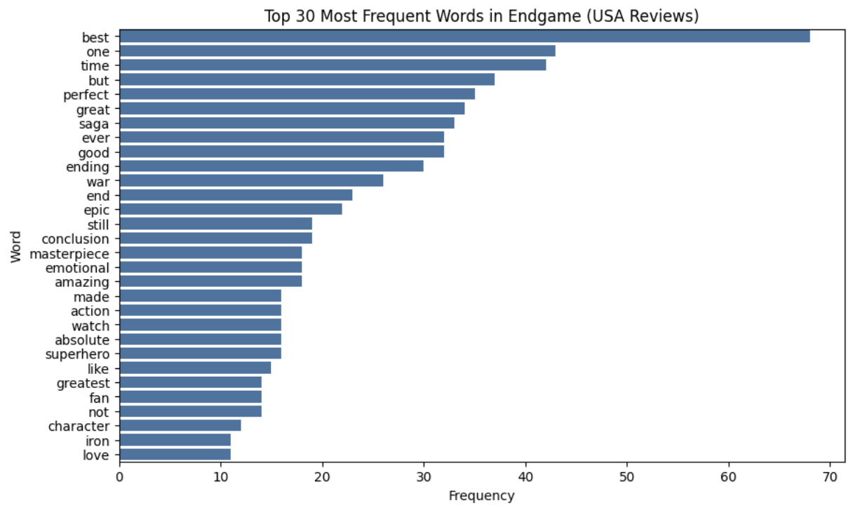 Although both U.S. and Korean audiences gave Avengers: Endgame very high overall ratings, the sentiment distributions revealed a noticeable difference.In the U.S. dataset, approximately 77.7% of reviews were classified as positive. This indicates that American reviewers tended to express their approval clearly and strongly. The frequent use of highly evaluative words such as best, perfect, and amazing further supports this pattern.In contrast, Korean reviews showed only 35.9% positive, while 43.9% were classified as neutral. Despite the high overall rating in Korea (9.5/10) and the presence of many positive words in the frequency analysis, the sentiment model detected a much larger proportion of neutral expressions.This suggests that the difference is not necessarily about how much audiences liked the movie, but rather how they expressed their emotions linguistically.